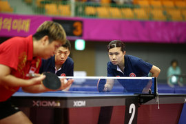 男雙賽事,港隊唐鵬/黃鎮廷3﹕1(7-11,13-11,11-5,11-3)反勝韓國組合晉身八強,但梁柱恩/江天一則以1﹕3不敵東道主的一對組合。