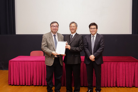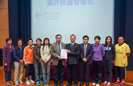 香港乒乓總會義務司庫郭嘯南先生代表出席頒獎儀式,並從康文署副署長 (康樂事務) 范偉明太平紳士及助理署長 (康樂事務)黃達明先生手中接過獎狀。