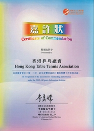 香港乒乓總會再次獲得康樂及文化事務署(康文署)頒發「體育資助計劃」嘉許狀,以表揚本會於2013/14年度工作表現卓越,對發展香港乒乓球運動不遺餘力。今年已經是本會連續第二年獲頒此項殊榮,對於本會的工作再次得到肯定,實在是極大的鼓舞。