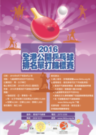 2016全港公開乒乓球排名單打錦標賽現已截止報名。 賽事賽程將於2016年 6 月 11 日(星期六)公佈。