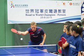 繼早前中國國家隊隊員應邀到恒生銀行總行親授「恒生乒乓球學院」學員球技後,學院再邀請前世界乒乓球錦標賽冠軍、來自瑞典的皮爾遜(Jörgen Persson)今日到香港體育學院舉行「世界冠軍皮爾遜教室」,與恒生精英隊、少兒精英隊學員分享他參加國際大賽的經驗及切磋球技。