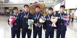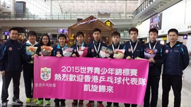 「2015世界青少年錦標賽」已圓滿結束,港隊一眾球員包括男團、男雙及混雙銅牌得主何鈞傑、吳柏男、關文皓、李逸軒及蘇慧音,教練及香港體育學院支援人員於今午凱旋歸來。球員經過接近十天緊密的賽事,仍顯得精神奕奕步出機場,各人喜獲香港乒乓總會送贈花束以示恭賀。