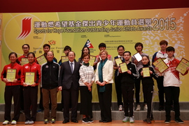 香港乒乓總會執行委員余國賢先生(後排右四)從體院院長李翠莎博士BBS(後排左三)手上接過「全年最積極參與體育總會獎」獎狀,並與曾獲2015傑出青少年運動員獎項的球員及家長聚首一堂。 |
