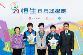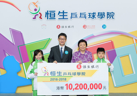 恒生銀行於2016至2018年將撥款港幣1,020萬元支持「恒生乒乓球學院」,推廣本地乒乓球運動。恒生銀行副董事長兼行政總裁李慧敏(右2)頒發支票予香港乒乓總會主席余國樑(左2),並由「恒生乒乓球學院」少兒精英隊隊員任奕溍(右1)及梁晴睎(左1)陪同。