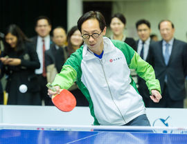 恒生銀行執行董事兼環球銀行及資本市場業務主管馮孝忠於「恒生乒乓球學院」典禮上舉行的友誼賽全神迎戰。
