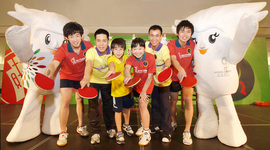 圖片一 「乒乓孖寶」李靜及高禮澤、體操王子李寧之兒子李小寧以及2008年度恒生乒乓球學院得獎同學,一同於切磋球技後合照。