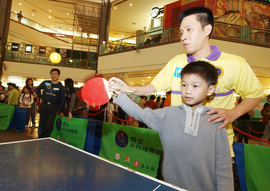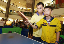 圖片二及三 「乒乓孖寶」李靜及高禮澤即場指導小朋友球技。