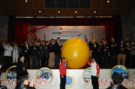 李靜及高禮澤將「愛心關懷大氣球」由台上傳到台下 |
