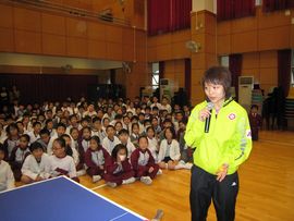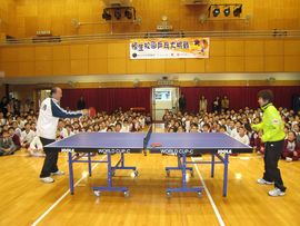 于國詩與老師一起作乒乓球示範