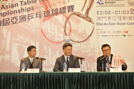由亞洲乒乓球聯盟授權,澳門特別行政區政府體育發展局及澳門乒乓總會共同主辦的 「第二十屆亞洲乒乓球錦標賽」將於本年2月23日至3月1日在澳門東亞運動會體育館舉行。為隆重其事,大會今天在澳門東亞運動會體育館傳媒中心舉行「第二十屆亞洲乒乓球錦標賽」新聞發佈會,公佈賽事詳情。