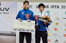 江天一(左) 及 黃鎮廷(右)在男子雙打決賽中以4﹕1力挫克羅地亞及波蘭混合隊 |