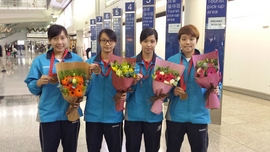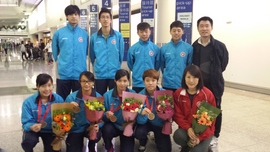 香港代表隊昨天凱旋歸來,各人經過十數小時的機程,雖然帶著疲憊的身軀,仍精神飽滿的步出機場,各人喜獲香港乒乓總會送贈花束。