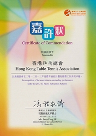 香港乒乓總會喜獲康樂及文化事務署(康文署)頒發「體育資助計劃」嘉許狀,以表揚本會於2012/13年度工作表現卓越,對發展香港乒乓球運動不遺餘力。