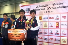 繼上周港隊17歲小將何鈞傑勇奪菲律賓公開賽男單冠軍之後,今午(25日)港隊男雙組合唐鵬/黃鎮廷也揚威澳洲,他們在今午上演的「澳洲公開賽」男雙決賽中以3﹕0殺敗楊子/詹健的一對新加坡組合,取得搭擋以來第二個巡迴賽男子雙打冠軍。此外,港隊小將李漢銘在U21男單賽事亦取得一枚銅牌;他在四強戰先勝後敗,以3﹕4(11-6,6-11,10-12,11-7,8-11,11-5,2-11) 不敵日本球手SAKAI Asuka而無緣決賽。