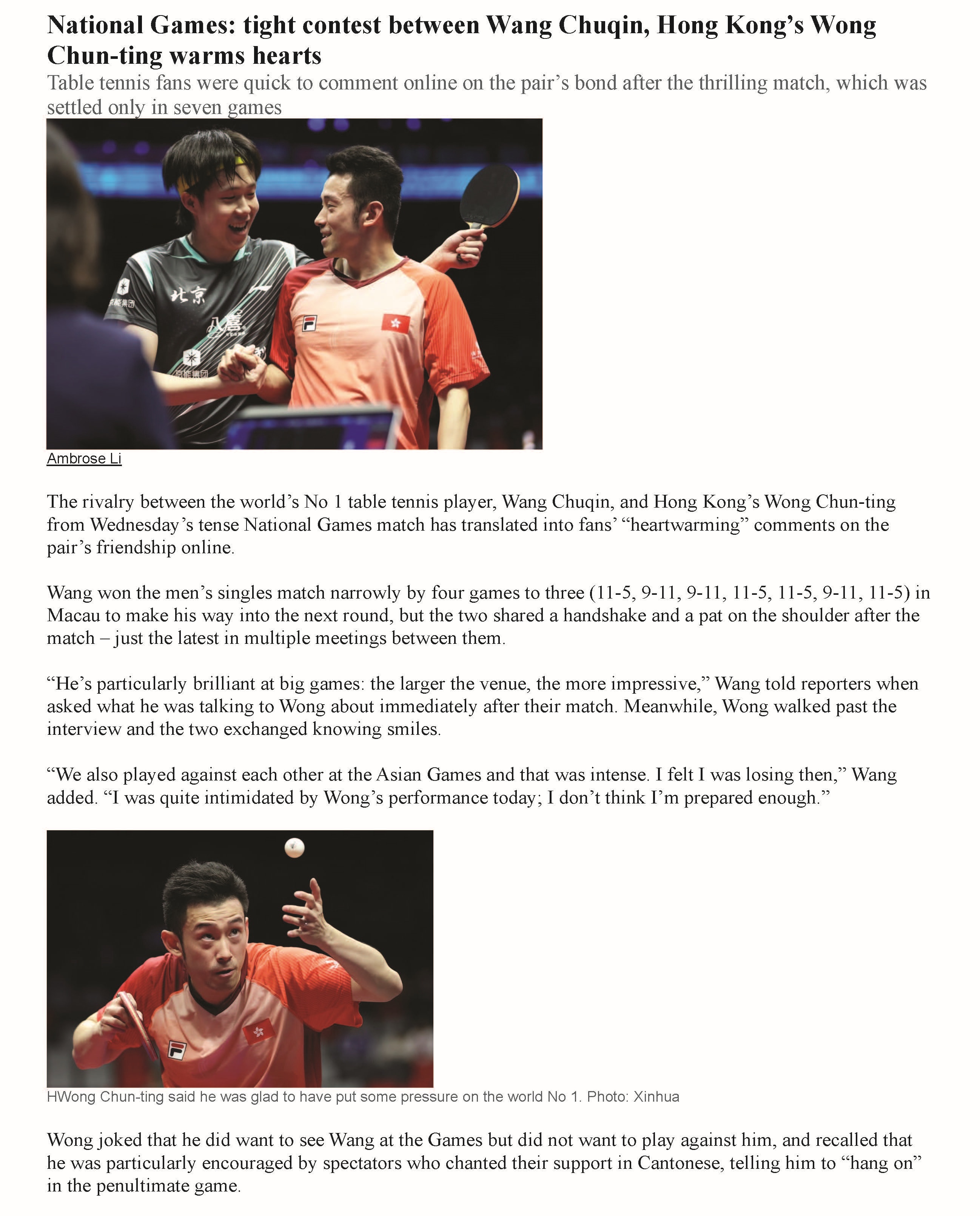 13/11/2025 - National Games: tight contest between Wang Chuqin, Hong Kong's Wong Chun-ting warms hearts (SCMP)