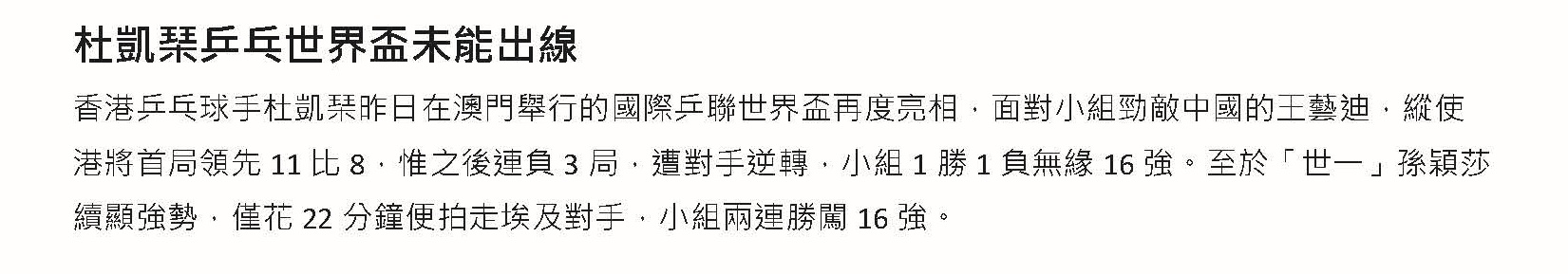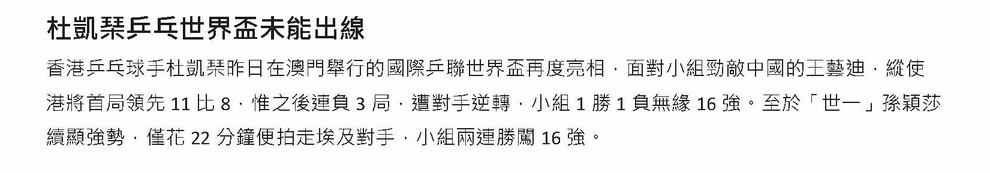 02/04/2026 - 杜凱琹乒乓世界盃未能出線 (東方日報)